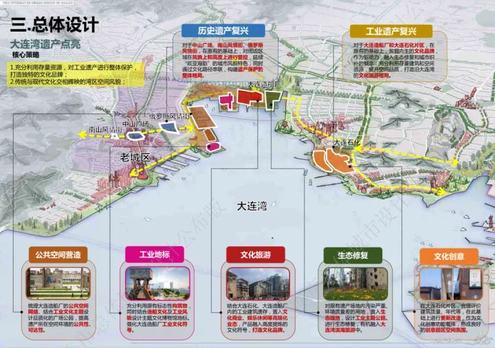 大连是一座海港城,造船厂、老码头……特色文化凸显。充分利用存量资源,对工业遗产进行整体保护,传统与现代文化交相辉映,打造大连独特的湾区文化品牌。在南山风情街、中山广场、俄罗斯风情街的基础上,对周边区域在风貌和高度上进行管控,文化路径串联成线,构建遗产保护的整体格局,实现历史遗产的复兴。结合造船厂的工业风貌,设计主题文化博物馆,打造工业地标,营造公共性与可达性兼顾的品质化广场公园。