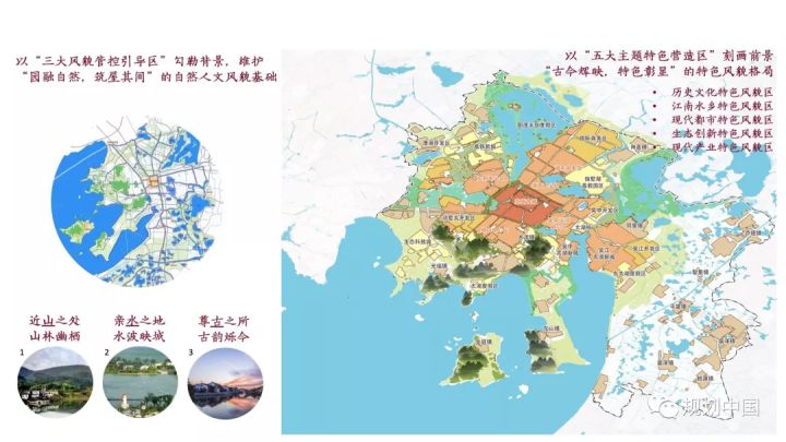 风貌上,“近山、亲水、尊古”之地维护好背景,城市里“五大主题特色营造区”彰显出特色,展现“园融自然,筑屋其间,古今辉映、特色彰显”的风貌格局。